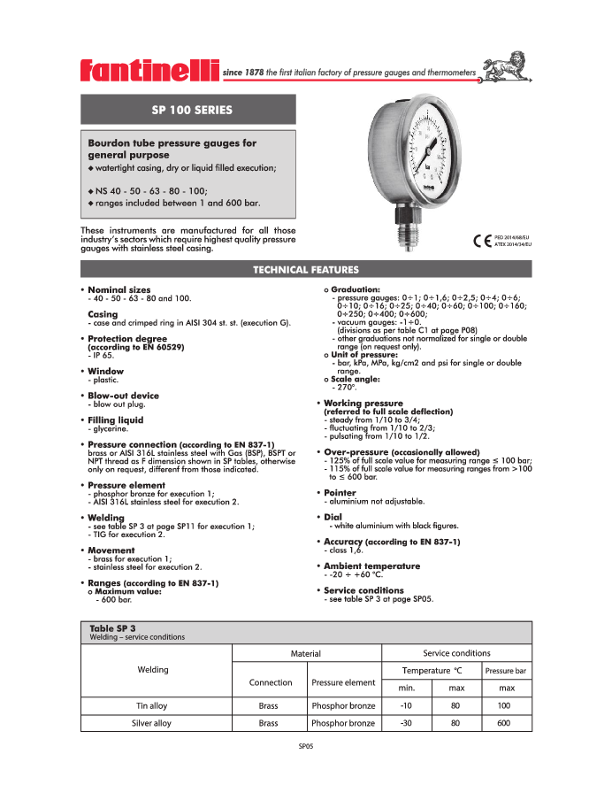 • Pressure connection (according to EN 837-1) brass or AISI 316L stainless steel with Gas (BSP), BSPT or NPT thread as F dimension shown in SP tables, otherwise only on request, differenf from those indicated.